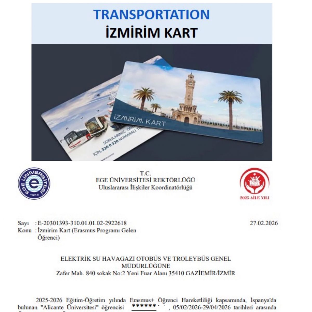 To obtain your student transportation card, you should apply at the Transportation Card Directorate at one of the addresses below.